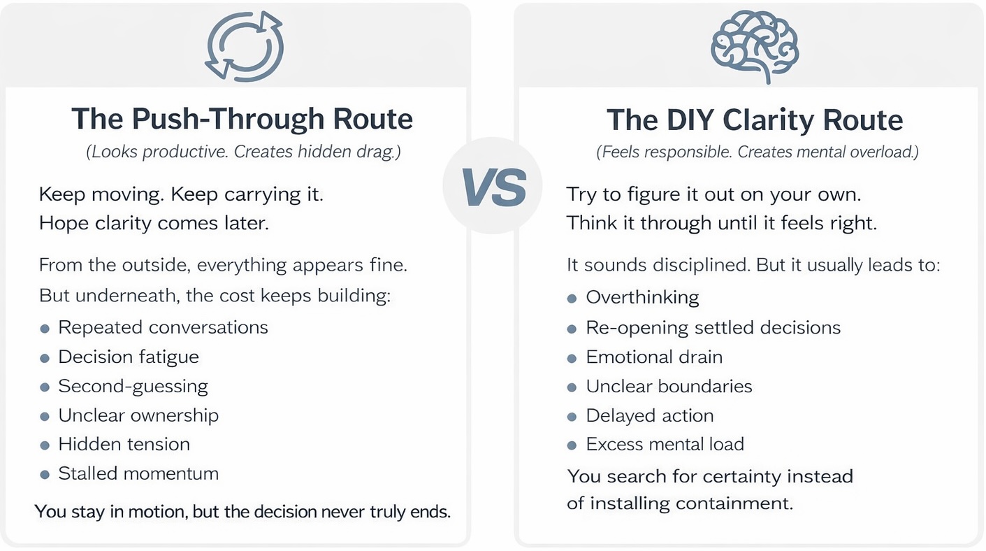 We’ll help you name the containment: owner, scope, time boundary, and reopen rule, so the decision can finally hold.